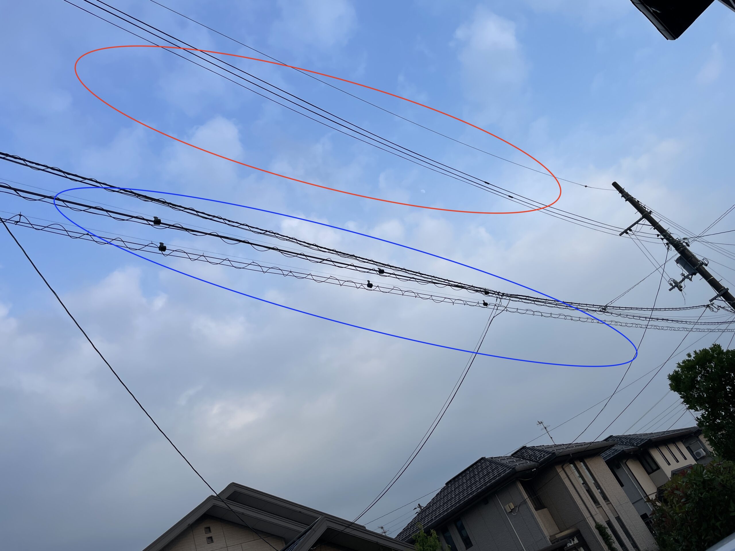 赤枠の電線・・・電力会社の電線