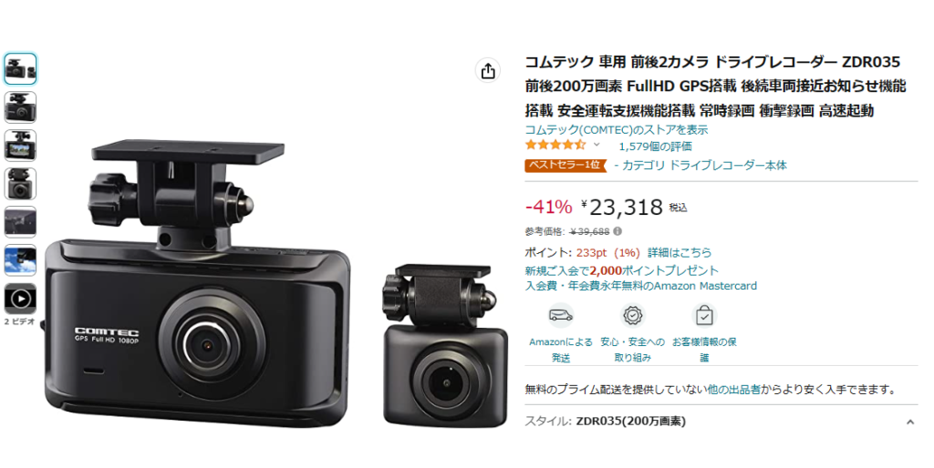 私が購入したコムテックのドライブレコーダー「ZDR035」でした。