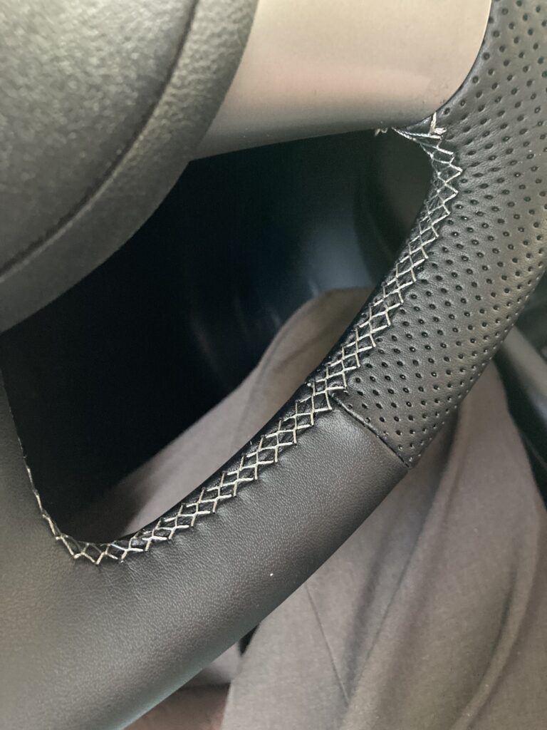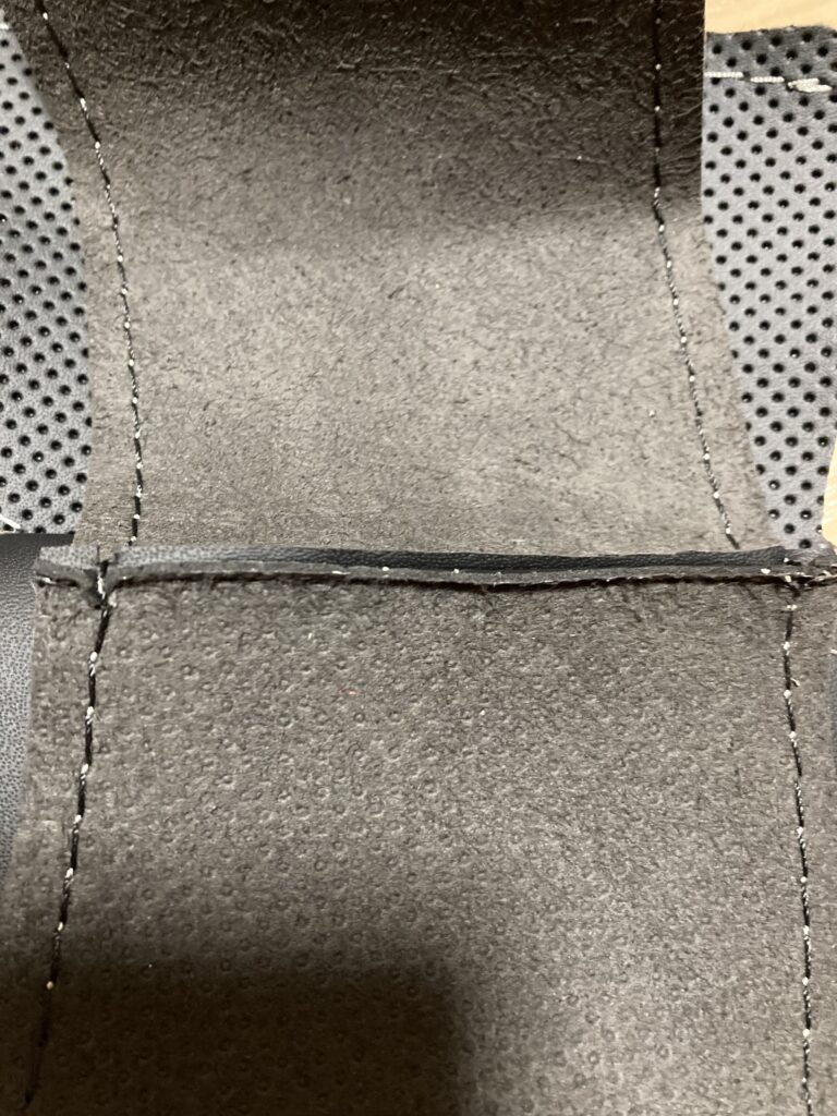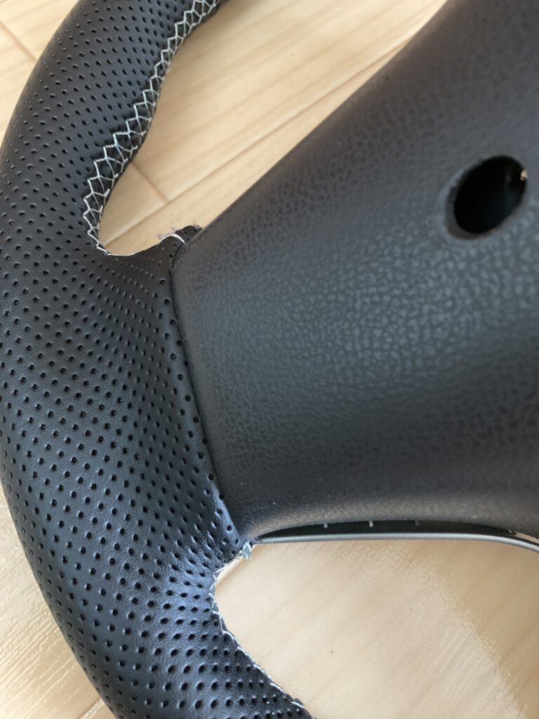 最近、海外のyoutube動画を見ていて学んだ、きれいに仕上げるコツとしては、革の継ぎ目の部分を上手くステアリングに入れ込むというものです。