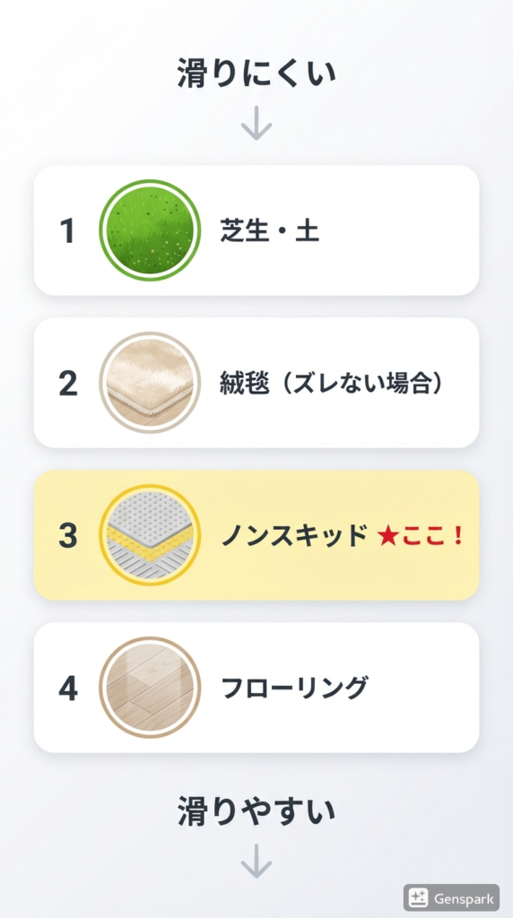 フローリングとは比較にならないほど滑りにくくなります。